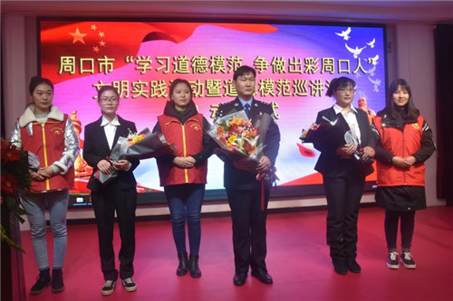 市公安局交警王凱偉是2018年敬業(yè)奉獻(xiàn)類中國好人,省五四獎(jiǎng)?wù)芦@得者,經(jīng)常參加公益活動(dòng),持續(xù)幫助貧困女孩小夢(mèng)麗和她家人,用善舉挽救了這個(gè)貧困家庭。扶溝縣曹里鄉(xiāng)刁灣小學(xué)教師李艷琴扎根鄉(xiāng)村教育一線無怨無悔,數(shù)年如一日照顧癱瘓?jiān)诖驳钠牌湃蝿谌卧?,曾獲縣最美鄉(xiāng)村老師稱號(hào)。鹿邑伯陽中學(xué)“90后”女教師劉交交剛參加完高考后父親因病去世,母親身患?xì)埣病K幌蛎\(yùn)低頭,靠打工收入和微薄的助學(xué)金維持生活和學(xué)業(yè),為照顧母親,她攜母上大學(xué),曾獲中國大學(xué)生自強(qiáng)之星等稱號(hào),被授予省五四獎(jiǎng)?wù)?。三位道德模范雖然都是最平凡的人,但都有一顆不平凡的心,他們的感人事跡散發(fā)著奪目的光芒,深深感染了現(xiàn)場(chǎng)的每一位聽眾,不少人流下了感動(dòng)的淚水。