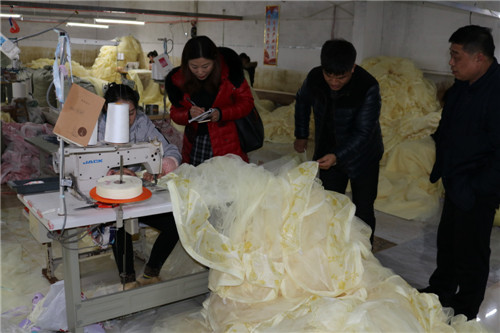 “對于有勞動能力的貧困戶及留守婦女,只要報名一律錄用,根據(jù)個人能力提供合適崗位,免費進行業(yè)務(wù)技能培訓(xùn),變‘輸血’變‘造血’;成為熟練工的貧困戶,月收入均可達到3000元以上?!苯饎P盛家紡“扶貧車間”位于吳小廟村邊,該公司負責(zé)人趙開軍是楊湖口鎮(zhèn)走出去打工、在事業(yè)有成后返鄉(xiāng)創(chuàng)業(yè)的一個普通80后,他的公司總部位于江蘇省南通市,像這樣的幾百人加工基地附近有二三家,加工的產(chǎn)品一般是通過天貓、京東等知名電商平臺在全國進行銷售,實行網(wǎng)上實行統(tǒng)一下單、就近發(fā)貨,這幾個基地主要負責(zé)長江以北市場銷售,公司去年年銷售額已突破5000萬元,解決周邊村莊數(shù)千人在門口就業(yè),帶動100多戶貧困戶脫貧。