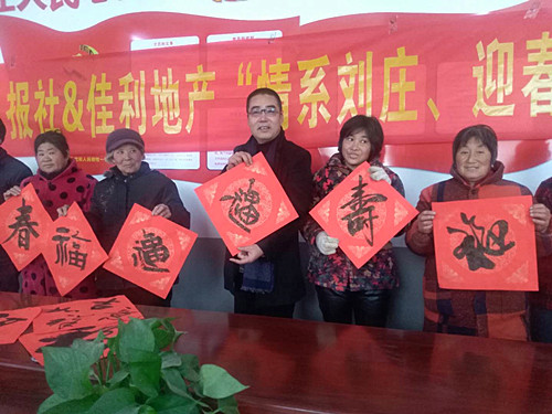 1月25日,周口報業(yè)傳媒集團偕愛心企業(yè)佳利偉業(yè)、周口農(nóng)商銀行,邀請周口藉中國書協(xié)會員靳玉峰、曾祥峰等,來到淮陽馮塘劉莊村,為群眾義寫、贈送春聯(lián)500多套,村委大院一片歡騰,喜氣洋洋。