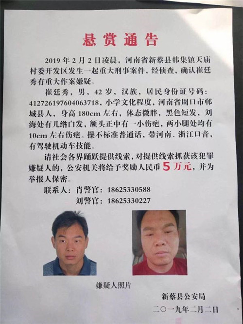 2月2日凌晨,駐馬店新蔡縣韓集鎮(zhèn)發(fā)生一起重大刑事案件,犯罪嫌疑人崔某因懷疑其妻子與受害人楊某有不正當(dāng)關(guān)系,午夜駕車(chē)沖進(jìn)受害人楊某的居住地放火將其殺害,犯罪嫌疑人崔某趁夜色潛逃。新蔡縣公安局黨委啟動(dòng)重大刑事案件偵破機(jī)制,緊急發(fā)布公安協(xié)查通報(bào),請(qǐng)求兄弟單位協(xié)助抓捕。并發(fā)布懸賞通告,懸賞5萬(wàn)元通緝崔某。結(jié)合犯罪嫌疑人崔某可能逃跑路線,新蔡警方先后輾轉(zhuǎn)溫州、青島、臨泉、周口等地開(kāi)展抓捕工作,均未果。