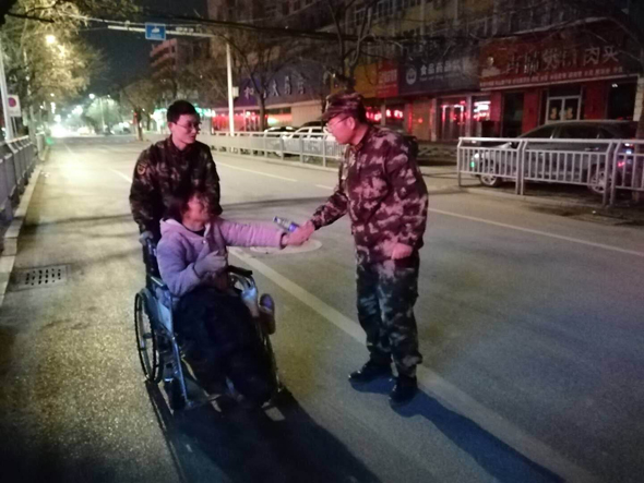 人民軍隊愛人民,無論山高水遠,歲暮天寒。2月18日凌晨1時許,武警周口支隊政委韓偉鋒查勤歸來,在支隊大門口恰巧遇到一位大姐獨自一人搖著輪椅艱難前行。當晚氣象局預報有降雪,實時氣溫也只有-4℃。夜深人靜,天凝地閉,韓政委有些擔憂這位大姐的安全,連忙上前詢問情況,并步行推著輪椅將大姐送至目的地。其實,這件事只是武警周口支隊愛民助民工作的一個縮影。