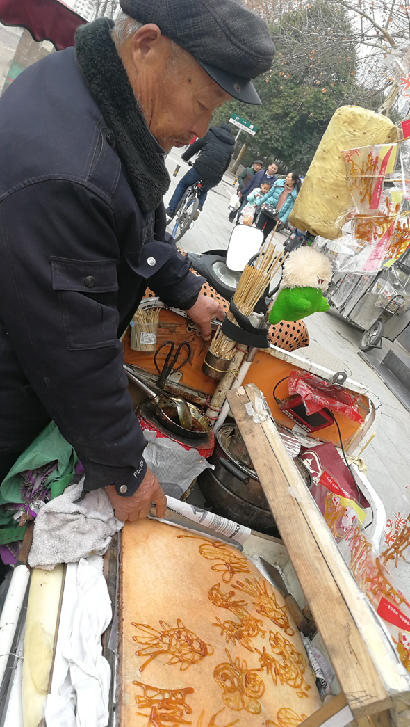 以糖稀為原料制作一幅糖畫,只需要1分多鐘。昨日,記者在中心城區(qū)七一路與六一路交叉口附近,目睹了閆先生制作糖畫的過程。閆先生以糖稀為原料制作的小動(dòng)物惟妙惟肖,還有“?!薄皭邸钡茸?。閆先生告訴記者,他是周口本地人,制作糖畫已30多年。記者 關(guān)秋麗 攝
