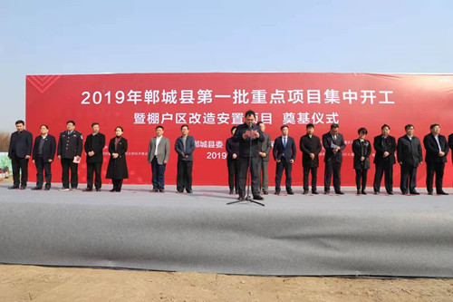 3月6日上午,鄲城縣舉行2019年全縣第一批重點項目集中開工暨棚戶區(qū)改造安置項目開工奠基儀式??h委書記羅文閣,河南中原建業(yè)城市發(fā)展有限公司董事長陳建業(yè),總裁馬驍騰,縣長李全林,縣人大常委會主任李建軍,縣政協(xié)主席姜永來,縣委常委、常務(wù)副縣長王智華等出席開工儀式。