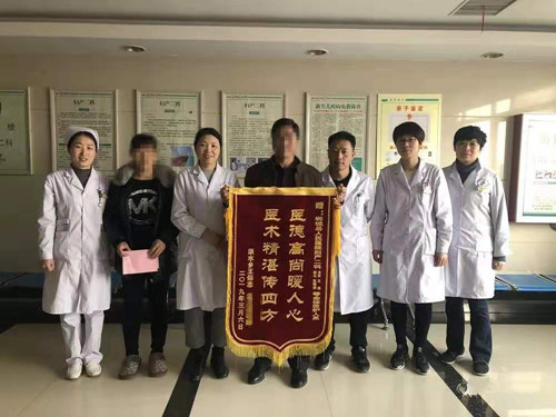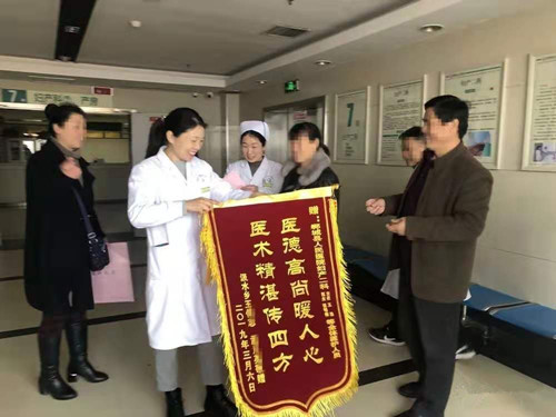 術后患者恢復良好,康復出院后,3月6日上午,患者和丈夫一起來到醫(yī)院,向住院期間給予了精準治療和細心護理的婦產二科王皓主任、張明偉醫(yī)生及全體醫(yī)護人員贈送錦旗,以表謝意。