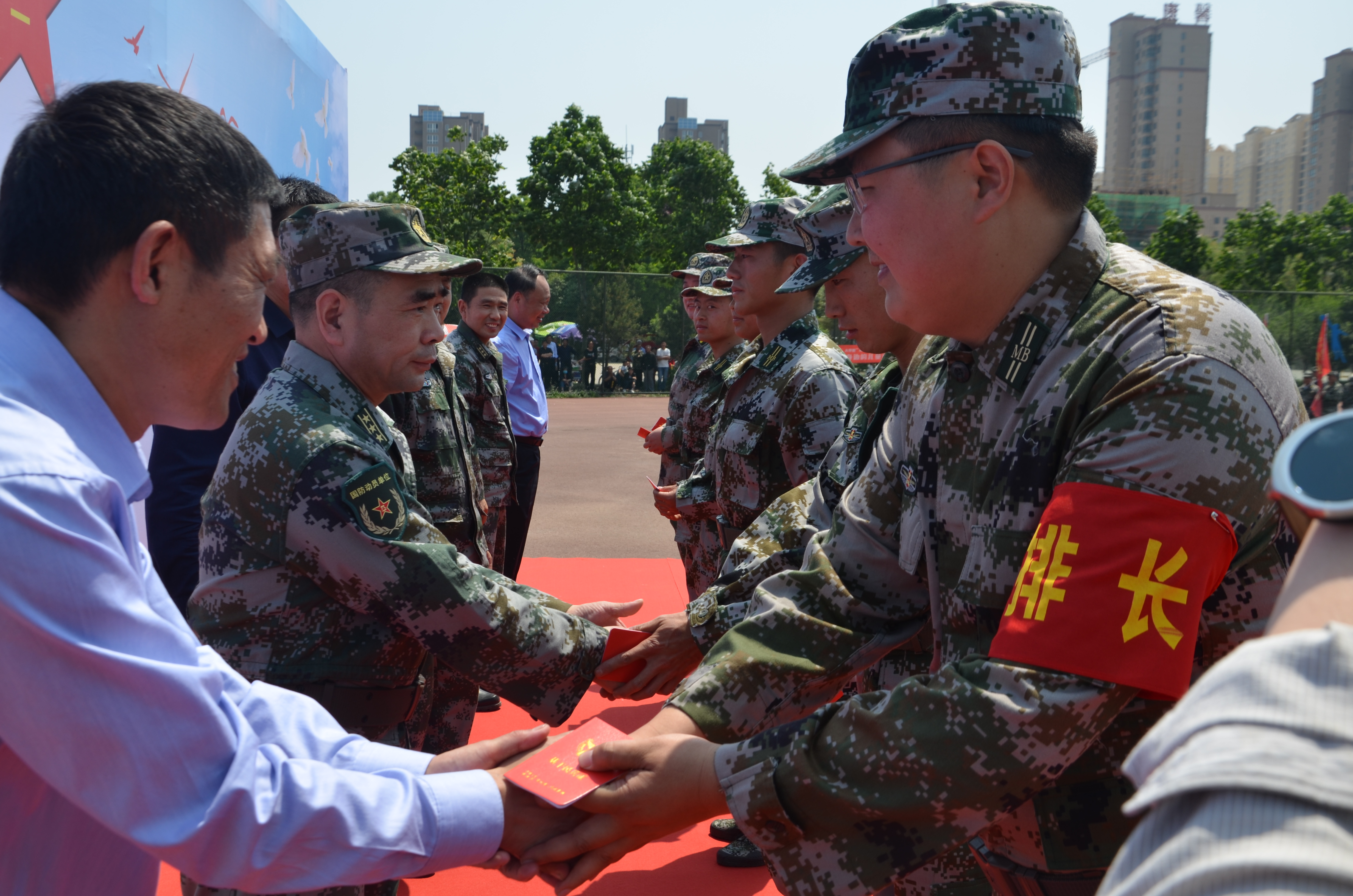 大會(huì)在雄壯的《解放軍軍歌》中拉開(kāi)了序幕??h委常委、人武部政委曹新旺宣布基干民兵排以上干部任職命令,縣委常委、常務(wù)副縣長(zhǎng)郝四春代表縣委、縣政府、縣人武部為基干民兵分隊(duì)授旗,綜合應(yīng)急連指導(dǎo)員、縣人武部政工科長(zhǎng)李紅藝帶領(lǐng)全體民兵面對(duì)國(guó)旗宣讀民兵誓詞。在場(chǎng)領(lǐng)導(dǎo)向民兵代表發(fā)放了基干民兵證和入隊(duì)通知書(shū),民兵代表和教練員代表分別進(jìn)行了表態(tài)發(fā)言。