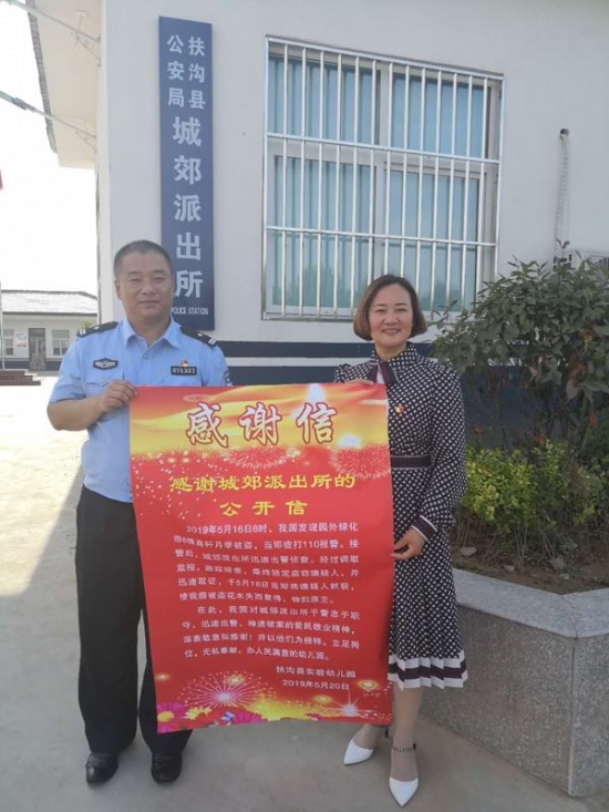 5月20日上午,扶溝縣實驗幼兒園把一封感謝信送到城郊派出所民警手中,表達(dá)對該所民警迅速出警,快速辦案的敬意和謝意。