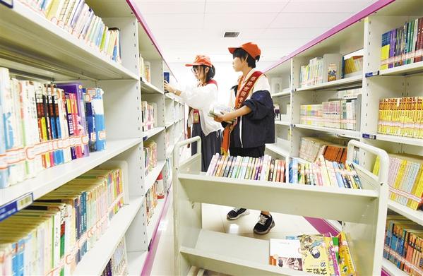 7月2日,在圖書(shū)館,參加“我當(dāng)小圖書(shū)管理員”社會(huì)實(shí)踐活動(dòng)的學(xué)生在整理圖書(shū)。