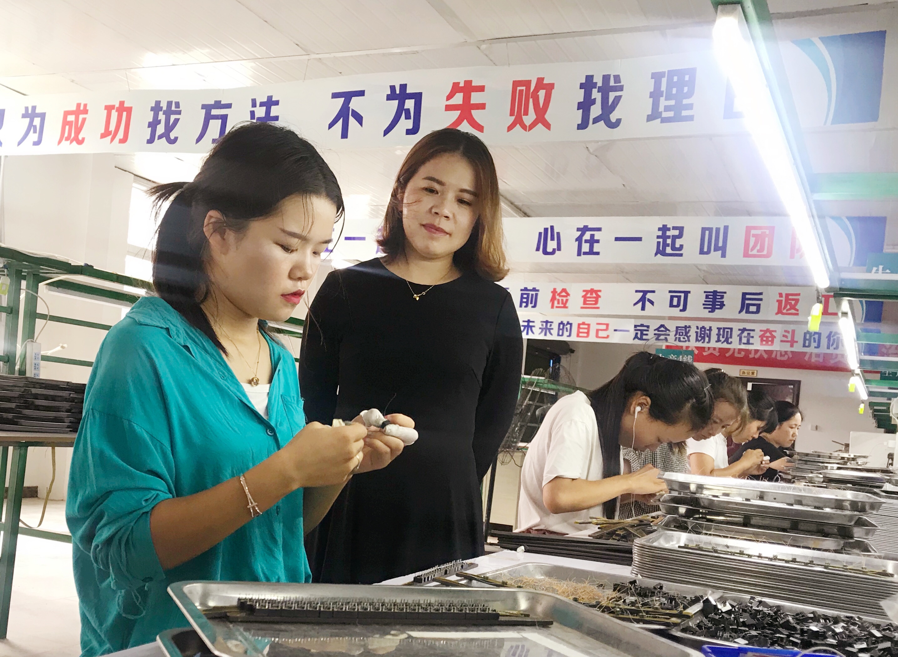 河南雙晨電子科技有限公司去年落戶(hù)西華縣大王莊鄉(xiāng)劉老家村后,生產(chǎn)線安裝繞線機(jī)、點(diǎn)焊機(jī)、包裝機(jī)等近50臺(tái),產(chǎn)品廣泛用于液晶顯示屏、計(jì)算機(jī)、數(shù)碼相機(jī)、醫(yī)療設(shè)備、汽車(chē)等,目前已安置群眾就業(yè)50余人,其中貧困戶(hù)近20人,人月均收入3000多元,讓村民在家門(mén)口實(shí)現(xiàn)就業(yè)增收。圖為該公司總經(jīng)理在生產(chǎn)車(chē)間了解工人收入和家庭生活情況。