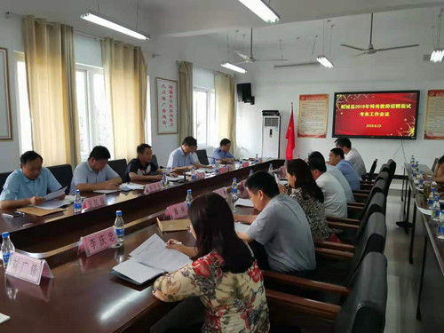 考務(wù)會(huì)由楊培爭(zhēng)主持,劉自忠宣布了面試工作領(lǐng)導(dǎo)組及考務(wù)分工情況,劉現(xiàn)營(yíng)解讀了《2019年特崗教師招聘面試考務(wù)工作實(shí)施辦法》,強(qiáng)調(diào)了紀(jì)律要求。