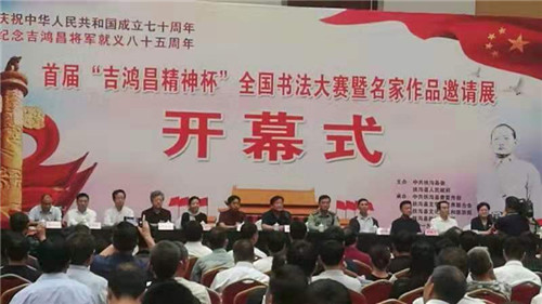 為紀(jì)念抗日民族英雄吉鴻昌將軍就義85周年,大力弘揚愛國主義精神和中華民族優(yōu)秀傳統(tǒng)文化,9月28日上午,首屆“吉鴻昌精神杯”全國書法大賽暨名家作品邀請展在扶溝縣體育館隆重舉行。原廣州軍區(qū)政治部副主任陳大民少將、解放軍報社原副社長田仁德少將、解放軍報社原副總編孫臨平少將、解放軍裝備學(xué)院原副政委孫南京少將、解放軍總后勤部某研究所原所長楊廷欣少將、吉鴻昌將軍親屬鄭吉安大校,市委常委、周口軍分區(qū)政委孫先振,市政協(xié)副主席張文平,扶溝縣四個班子領(lǐng)導(dǎo)及副處級干部等出席開幕式??h委副書記、政法委書記詹凱主持儀式。