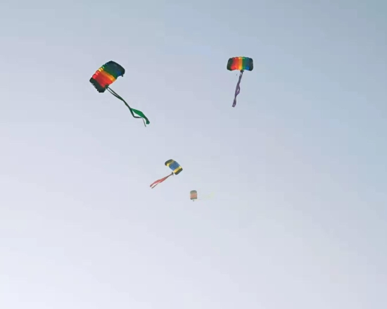 “看,跳傘表演開始了?!?0月29日上午,周口西華通用機(jī)場(chǎng)首航儀式結(jié)束后,一場(chǎng)精彩絕倫的飛行表演就開始了。載著跳傘運(yùn)動(dòng)員的飛機(jī)起飛到指定地點(diǎn)后,運(yùn)動(dòng)員攜帶著國旗和彩帶從高空中跳下,打開傘包后,空中五顏六色十分漂亮,引得圍觀群眾不時(shí)叫好。