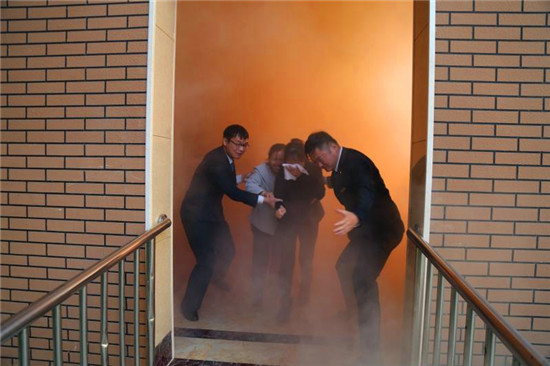 記者在現(xiàn)場(chǎng)看到,隨著消防警鈴的響起、煙霧的彌漫,來(lái)自物業(yè)公司和社區(qū)的數(shù)十名群眾彎著腰,同時(shí)用濕毛巾捂著口鼻,緊急而有序地從步梯撤出,與此同時(shí),消防隊(duì)員迅速將消防水袋和槍頭同消防栓相連接,并打開(kāi)消防栓對(duì)準(zhǔn)“火勢(shì)”,一瞬間,發(fā)生在建業(yè)社區(qū)的一場(chǎng)“火災(zāi)”被及時(shí)撲滅,現(xiàn)場(chǎng)圍觀(guān)的眾人爆發(fā)出陣陣掌聲。
