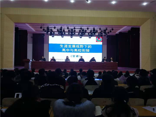 甘諾教授以“生涯教育視野下的高中和高校銜接”為題,從“職業(yè)生涯喚醒、興趣能力與文理分科、走進(jìn)象牙塔、外面的世界很精彩”四個(gè)方面做了精彩報(bào)告,并對選科依據(jù)、基本原則、高校錄取及志愿填報(bào)應(yīng)注意的問題進(jìn)行了詳細(xì)的解讀,還就大學(xué)大類招生及霍蘭德職業(yè)興趣測評個(gè)性特質(zhì)與大學(xué)專業(yè)分類如何匹配進(jìn)行了專業(yè)分享。