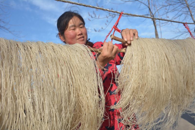 沒有鮮花、沒有禮炮、沒有舞臺、沒有相關單位參加、沒有任何領導講話,空地上只有一些民間藝人在扭秧歌、挑花籃、跳廣場舞;大門口簡單設置了幾個種子肥料小展臺和幾個抽獎箱;屋內(nèi)庫房內(nèi)擺滿了成箱成捆子的粉條;不遠處的路邊地頭扯起來的長繩掛滿了剛出“凍房”的濕粉條。