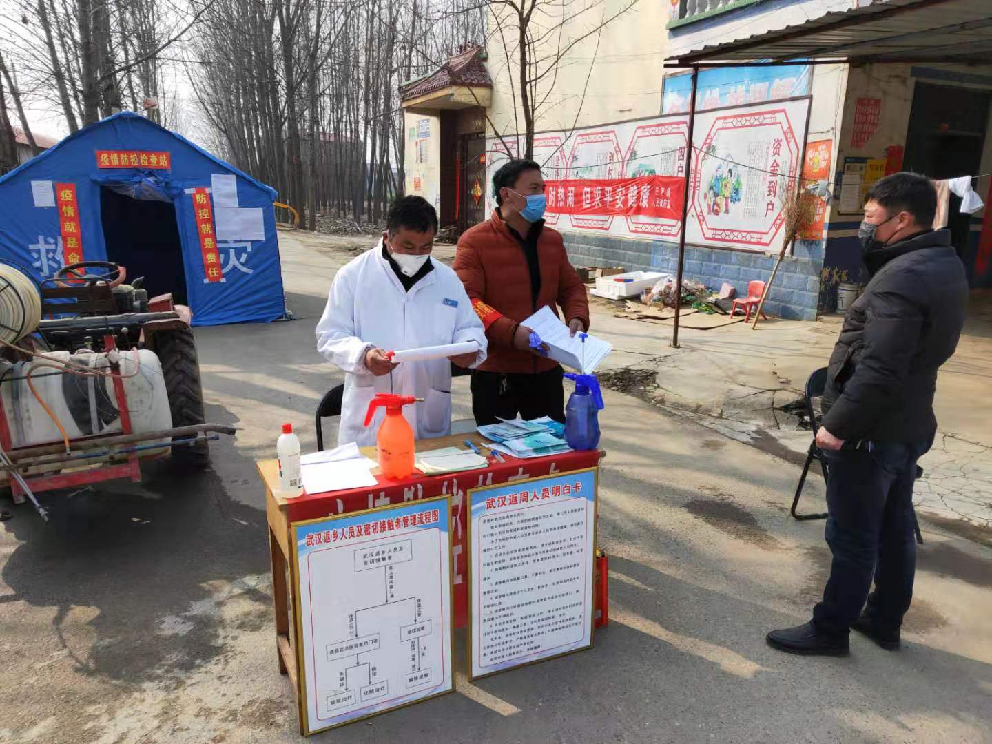 記者在該鎮(zhèn)順便走到幾卡點(diǎn)看到:每個(gè)卡點(diǎn)都搭有帳篷,插一面黨旗,有人員值守,有進(jìn)出人員登記冊(cè),有消毒液,有電子溫度計(jì),張貼有告知書(shū),懸掛有《武漢返周人員明白卡》《返鄉(xiāng)人員及密切接觸者管理流程圖》等。