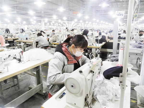 2月26日,商水縣阿爾本制衣有限公司的員工正在生產(chǎn)車間加工服裝。商水縣在嚴(yán)格做好疫情防控的同時,又做好企業(yè)復(fù)工復(fù)產(chǎn)工作。目前,該縣10家大型企業(yè)和6個扶貧車間有返崗人員3萬多人。喬連軍攝