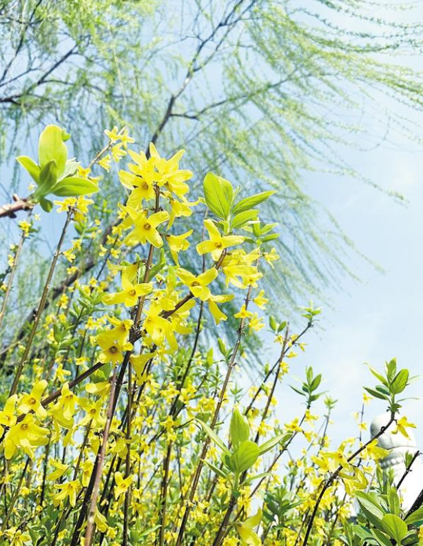 作為春天的信使,一叢叢嬌黃的連翹花,為大地帶來了濃濃春意?;ǘ湓诖猴L(fēng)的吹拂下?lián)u曳,團團簇簇,涌動如金色波浪。走近之時,聞花香淡雅、賞滿枝金黃,人們也以“報春花”來稱呼它。