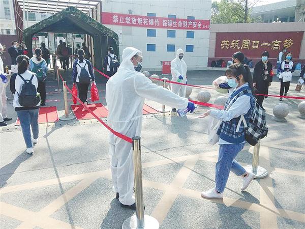 圖一 4月7日,周口一高三年級學生在入校前測量體溫。當天,我市高中三年級學生正式復課,廣大學生按照疫情防控要求,錯峰、錯時有序入校。 記者 張洪濤 攝