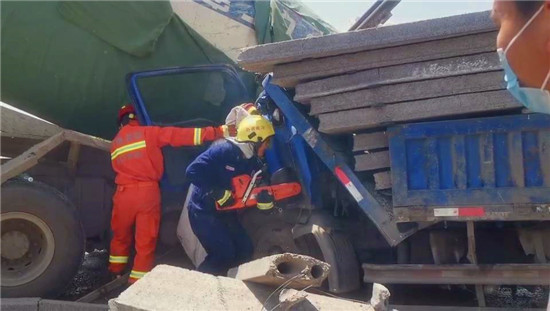 據(jù)了解,由于兩車相撞產(chǎn)生的沖擊力導(dǎo)致貨車與水泥灌車的車體緊緊連在一起,貨車駕駛員被卡在駕駛位上無法動彈。為了能盡快將被困司機救出來,現(xiàn)場指揮員指揮救援人員協(xié)助現(xiàn)場交警、路政部門立即對事故路段進行封鎖處理,并設(shè)置安全員對過往車輛進行警示,保證救援工作正常開展。同時,另一組救援人員首先對壓住駕駛室的石板進行清理,然后使用液壓器材工具組進行破拆,并對駕駛員腿部被擠壓部位進行擴張。經(jīng)過十五分鐘的緊急救援,被困司機被成功救出后移交現(xiàn)場救護車送往醫(yī)院治療。