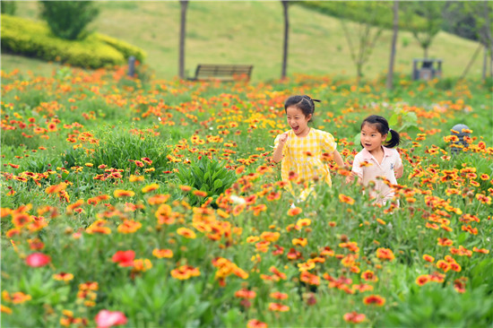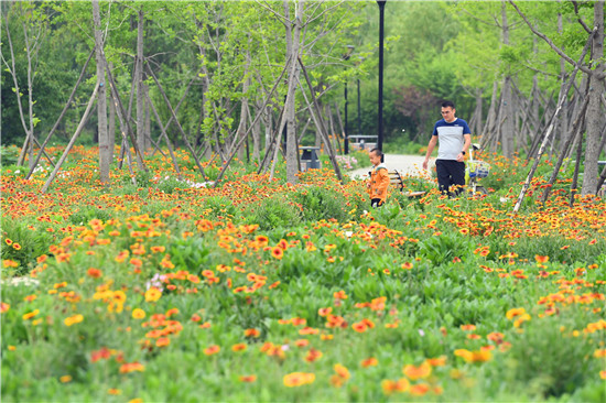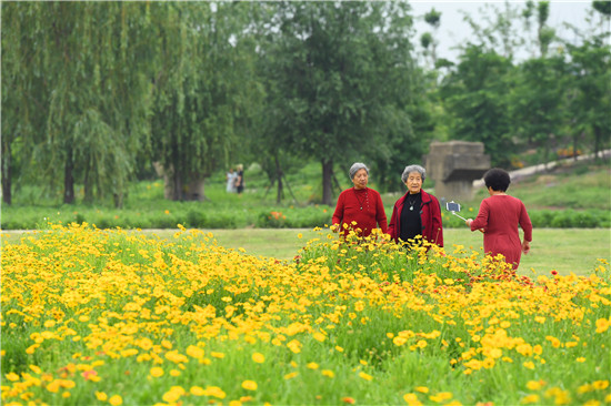 5月17日,市民徜徉在東方園林的花海中,暢享休閑樂趣。近期,位于沙潁河南岸的東方園林內(nèi),成片的天人菊等花卉相繼盛開,猶如五彩的花海,不少市民來(lái)些游玩、拍照。