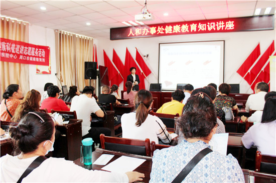 18日下午, “健康周口行 大醫(yī)獻(xiàn)愛心”健康教育志愿服務(wù)隊?wèi)?yīng)邀走進(jìn)川匯區(qū)人和辦事處,為干部職工和轄區(qū)居民作了《保持健康生活方式、掌握幸福長壽鑰匙》講座。講座現(xiàn)場,來自周口市中心醫(yī)院心內(nèi)四科的劉華玲主任利用ppt課件,分別從健康基本知識和理念、健康生活方式與行為及健康基本技能做了詳細(xì)分析講解,圍繞健康四大基石,結(jié)合群眾常見健康知識誤區(qū),對所講內(nèi)容進(jìn)行總結(jié)概括,進(jìn)一步加深了轄區(qū)居民對健康素養(yǎng)知識的理解。同時,結(jié)合真實病例,深入淺出地為大家講解了高血壓的基本概念、分類、高血壓治療原則和目標(biāo)、難治性高血壓的處理等,重點(diǎn)強(qiáng)調(diào)了高血壓常見危險因素及預(yù)防措施。