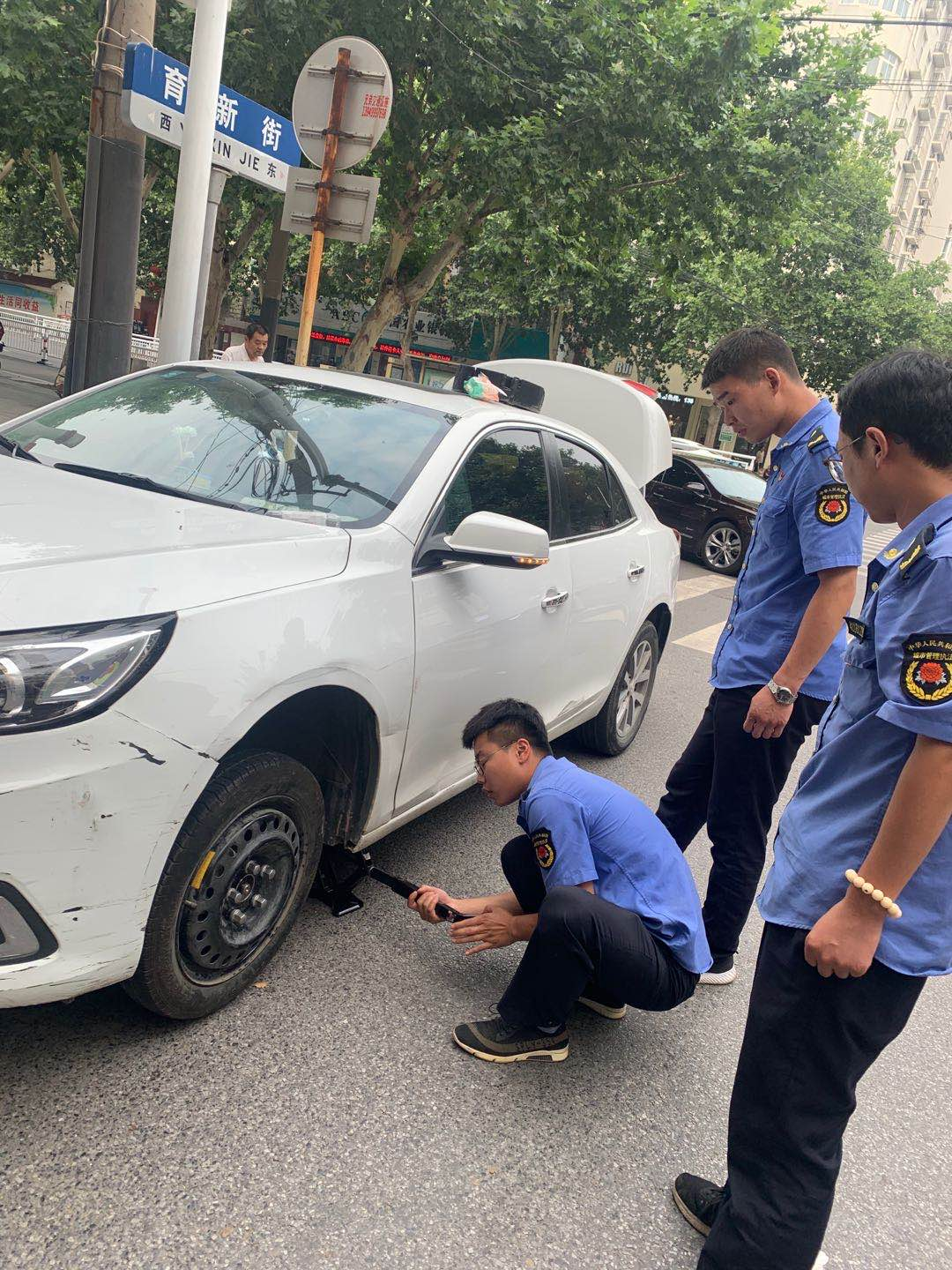 “我?guī)Ш⒆踊丶业穆飞?,沒想到汽車突然爆胎,天太熱了,孩子還小,一直哭鬧,我完全不知道該怎么辦。”女車主著急地向城管隊員講述了遇到的突發(fā)狀況。了解情況后,周自新、龐博、康棟棟、宋俊峰等隊員對女車主安撫后,在車前后設(shè)置安全警示、疏通交通。得知車上有備胎后,隊員們找出工具和備胎,決定更換輪胎。十分鐘后,車胎更換完畢,女車主十分感動,連聲感謝。