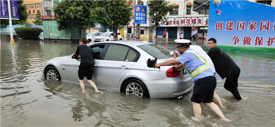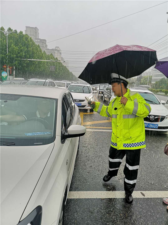 大雨滂沱,交通擁堵。7月22日,針對市區(qū)降大雨且部分路段出現(xiàn)嚴重積水的情況,交警及時啟動惡劣天氣應急預案,迅速投入到工作中。