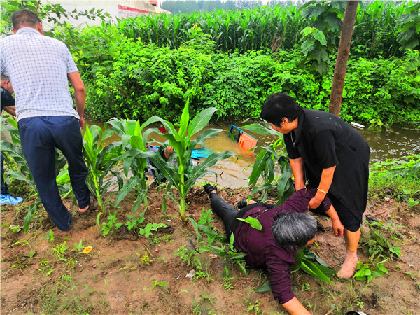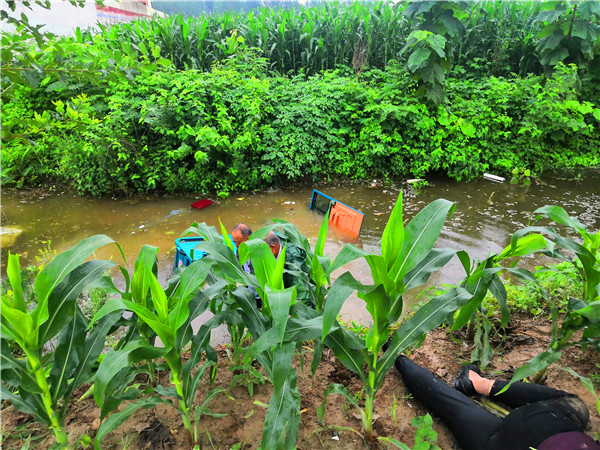 7月26日,連續(xù)多日的降雨已導(dǎo)致農(nóng)村坑滿河平、積水頗深。當(dāng)日下午4時(shí),依然時(shí)雷聲陣陣、雨如豆粒,二人在宜路鎮(zhèn)張寨村小學(xué)附近的玉米田間拍照核查“圖斑”時(shí),看到一輛車箱內(nèi)載有幾位老人的電動三輪車冒雨從路邊疾駛過去。緊接著聽到“撲通”一聲,趙文波、李偉二人立即意識到是三輪車掉進(jìn)路溝、落水了。