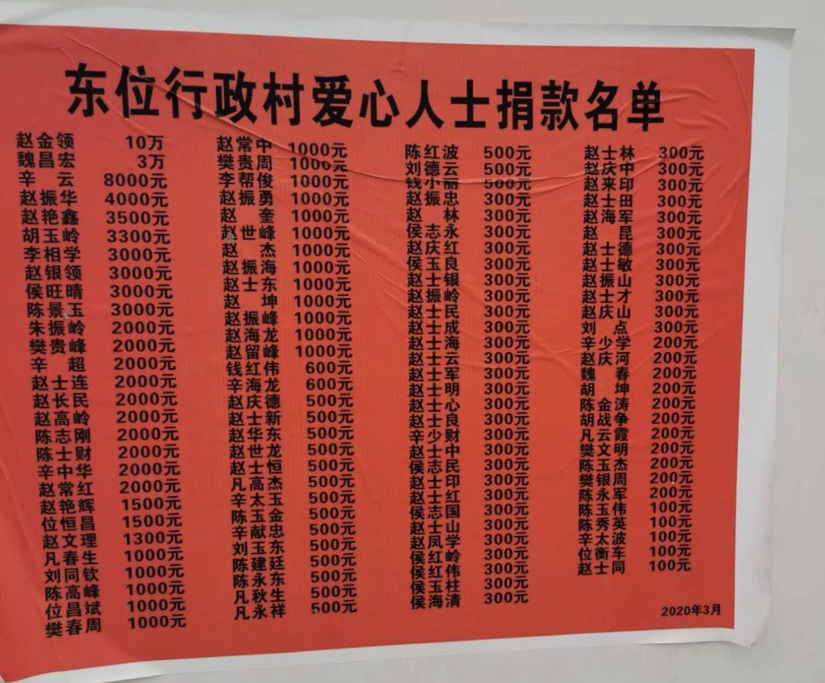 樊玉周向記者展示了兩份成績單:第一份是大家捐款明細。第二份便是鄉(xiāng)賢響應黨委政府號召參與美麗東位建設,為村莊帶來的新變化:實施坑塘改造1處面積300平方,道路硬化810米,硬化胡同5條700米并完善排水管道,綠化面積2600平方米,新建文化廣場3座,實施高標準農田水利建設,溝渠治理2800米,新挖機井45口,旱廁改造率80%以上,自來水、寬帶網(wǎng)絡實現(xiàn)全覆蓋,電網(wǎng)進行了全面改造,9個自然村路燈全覆蓋,趙莊自然村監(jiān)控全覆蓋……