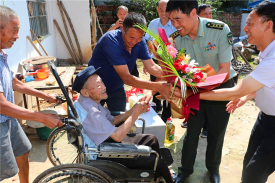 于永前一行來到楊廟鄉(xiāng)大祁行政村時已近中午,正趕上97歲抗日老戰(zhàn)士吳之太過生日。吳之太老少一家人歡聚一堂,其樂融融??吹轿繂柦M的到來,老人喜極而泣。吳之太老人擦著眼淚說:這些年沒少給黨和政府找麻煩,尤其是縣退役軍人事務(wù)局成立后,幫助他解決了好多困難和問題,并定期來看望他,今天又見到大家,真不知道該說什么好。潘布道代表退役軍人事務(wù)局向老人祝賀生日并告訴老人說:抗戰(zhàn)老戰(zhàn)士是民族的英雄、國家的財富,為黨的革命和建設(shè)作出了不可磨滅的貢獻(xiàn)。今后,將一如既往地關(guān)心和幫助抗戰(zhàn)老戰(zhàn)士,盡力幫助解決生活中的實際問題,在全社會形成尊重抗戰(zhàn)老戰(zhàn)士、尊崇抗戰(zhàn)老戰(zhàn)士、關(guān)愛抗戰(zhàn)老戰(zhàn)士的良好氛圍。