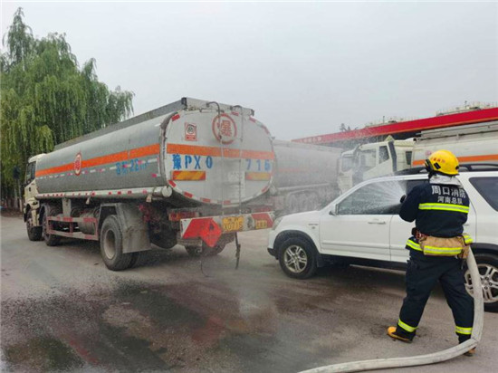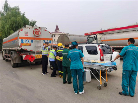 當(dāng)日上午10時(shí),商水交警大隊(duì)指揮中心接到報(bào)警:在商水縣興商大道與陳勝大道交叉口西、湯莊油庫處,一輛轎車與一輛?;饭捃囎肺蚕嘧玻9摅w損壞,危化品泄露起火,轎車駕駛室變形,駕駛?cè)吮焕к噧?nèi),如不及時(shí)救援,駕駛?cè)擞猩kU(xiǎn),另外因事故現(xiàn)場(chǎng)臨近湯莊油庫,如不及時(shí)處置可能發(fā)生爆炸,后果不堪設(shè)想。