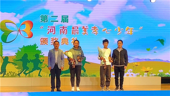 10月20日,河南省第二屆“河南最美孝心少年”頒獎(jiǎng)典禮在河南省實(shí)驗(yàn)學(xué)校鄭東小學(xué)舉行,全省表彰10名“河南最美孝心少年”,分別頒發(fā)獎(jiǎng)杯、證書和1萬元獎(jiǎng)勵(lì)。省教育廳副廳長(zhǎng)毛杰等領(lǐng)導(dǎo)為孝心少年頒獎(jiǎng)并合影留念。鄲城縣汲水二中學(xué)生薛勝楠光榮受獎(jiǎng)。
