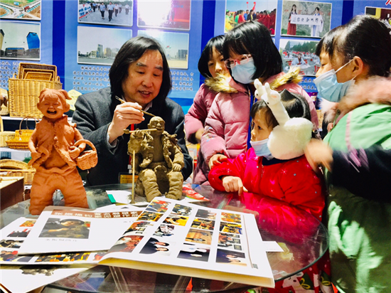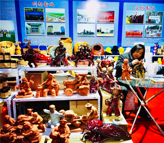 鄲城縣泥塑藝術大師張振福應邀攜48件作品參加大會,成為展會的一大亮點。其中原生態(tài)泥塑作品18件,有《磨豆汁》《耕耘》《酒逢知己》《二胡曲》等,鈞瓷泥塑作品20件,有《大金蟬》《年年有余》《豫東娃》《瑞牛迎春》等。張振福的作品表現(xiàn)豫東的鄉(xiāng)村人物,作品突出個性,憨態(tài)可掬,深受觀眾的喜愛,大家紛紛駐足觀看。