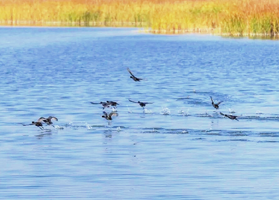 近日,我市天朗氣清、惠風(fēng)和暢,引黃調(diào)蓄工程天藍(lán)水碧、水天一色的風(fēng)景令人心曠神怡,其良好的生態(tài)環(huán)境吸引了很多水鳥前來(lái)?xiàng)ⅲ玢y鏡一般的湖面上綠頭鴨、赤麻鴨、白鷺、灰鷺等禽鳥成群結(jié)隊(duì),姿態(tài)各異。水鳥、湖水與藍(lán)天交相輝映,風(fēng)光旖旎,盡顯詩(shī)意。