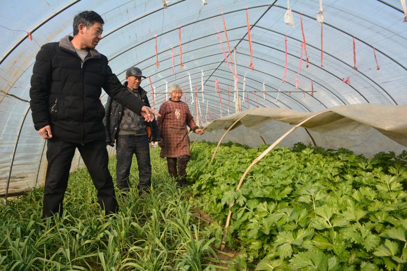 商水縣平店鄉(xiāng)葛樓村70多歲的菜農(nóng)楊志新、朱妮老兩口通過(guò)“棚套棚”“ 番茄—芹菜、蒜苗—芫荽”輪作套種,每畝大棚比傳統(tǒng)種法增收5000余元。圖為1月17日,村干部深入田間走訪了解其生產(chǎn)銷(xiāo)售及惠農(nóng)政策享受情況。