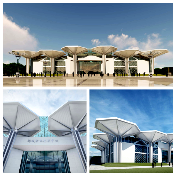 其中,傘業(yè)產(chǎn)業(yè)園電子商務(wù)服務(wù)中心項(xiàng)目由中國(guó)一冶承建,會(huì)展中心的設(shè)計(jì)概念以“傘啟鄲興”為主題,基于對(duì)本土特色文化的深入解讀、同時(shí)結(jié)合“傘”的具體特征,提煉傘蓋、傘骨、傘柄的特殊形象為基本元素。建筑主立面以八個(gè)巨大傘形構(gòu)架依次展開,巨型的尺度、新穎的造型有極強(qiáng)的昭示性,裝飾幕墻八邊形的單元分割也隱喻了傘蓋的造型,創(chuàng)新的視覺形象為傘業(yè)產(chǎn)業(yè)園增加了新的注解。會(huì)展中心整體的建筑風(fēng)格充分展示了鄲城傘業(yè)產(chǎn)業(yè)園的核心價(jià)值,形成獨(dú)具特色的地標(biāo)形象。