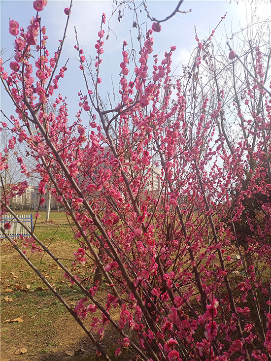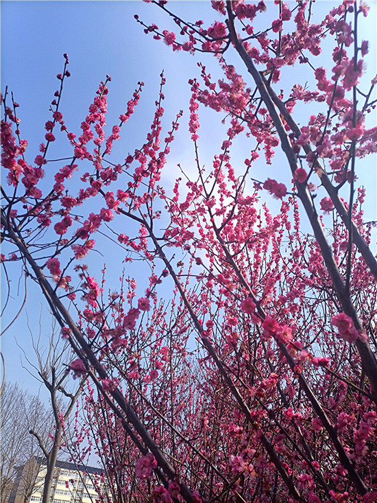 梅花,自古以來就是文人墨客筆下的??汀S性娫疲骸按猴L(fēng)試手先梅蕊,頩姿冷艷明沙水?!泵坊軌蛄韬㈤_,兼具冷艷和嬌媚,被譽(yù)為花中四君子之首。近日,我市天氣晴好,公園內(nèi)、道路旁,一樹樹梅花開的熱熱鬧鬧、密密匝匝,令人感受到濃濃的春意和無盡的美好。