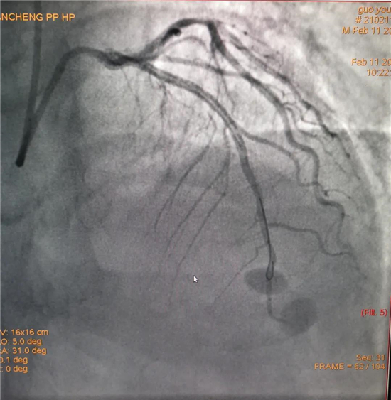 除夕,郭先生無明顯誘因突發(fā)胸痛,120急救人員到達現(xiàn)場,心電圖顯示:竇性心律完全性束支傳導阻滯。信息立刻發(fā)送到胸痛中心介入微信群中,心內(nèi)科值班醫(yī)生初步診斷為急性廣泛前壁心肌梗死,必須盡快進行急診支架治療,開通血管。值班醫(yī)生電話指導院前治療,并立即啟動胸痛綠色通道,24小時備班的介入治療團隊立即到位,9:30患者被送到導管室行冠脈介入診療,9:40急診PCI手術隨之開始,冠脈造影檢查提示左前降支閉塞,植入支架,堵塞的血管被順利打通,患者癥狀緩解,手術非常成功,10:20患者被送往病房進一步治療。