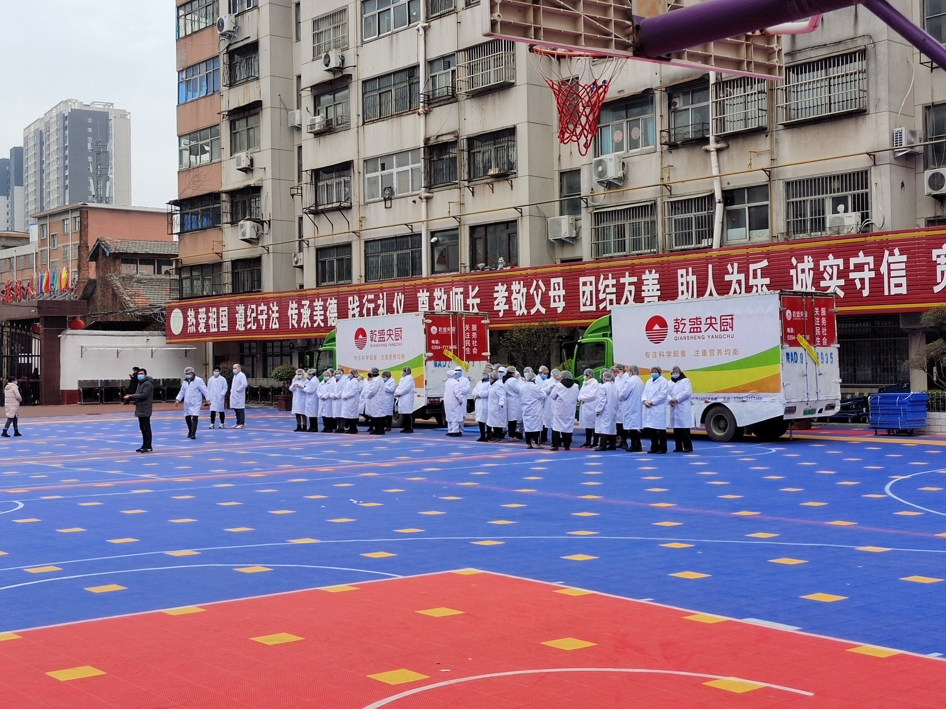 11時(shí)許,13000余份熱騰騰的飯菜即將送到周口市中心城區(qū)中小學(xué)生手中,直播團(tuán)隊(duì)對(duì)七一路二小的配送情況進(jìn)行現(xiàn)場(chǎng)直播。兩輛運(yùn)餐大卡車,20余名工作人員整裝待發(fā),乾盛央廚鄭州總公司的營(yíng)銷部負(fù)責(zé)人現(xiàn)場(chǎng)指揮調(diào)度七一路二小的發(fā)餐工作。揭掉卡車上的封條,留樣,測(cè)溫,裝車,按班分送,分發(fā)不銹鋼餐具,“哇!獅子頭?。 痹诤⒆觽兊捏@呼聲中,兩葷一素,一份米一份湯,熱氣騰騰地盛到孩子手中的餐具中。“孩子們吃不吃的飽呀?”面對(duì)各直播平臺(tái)上網(wǎng)友的提問,乾盛央廚鄭州總公司營(yíng)銷部負(fù)責(zé)人回答:“我們提前有準(zhǔn)備,飯、菜我們都免費(fèi)加,保證孩子們都吃飽,請(qǐng)家長(zhǎng)朋友們放心?!?/p>