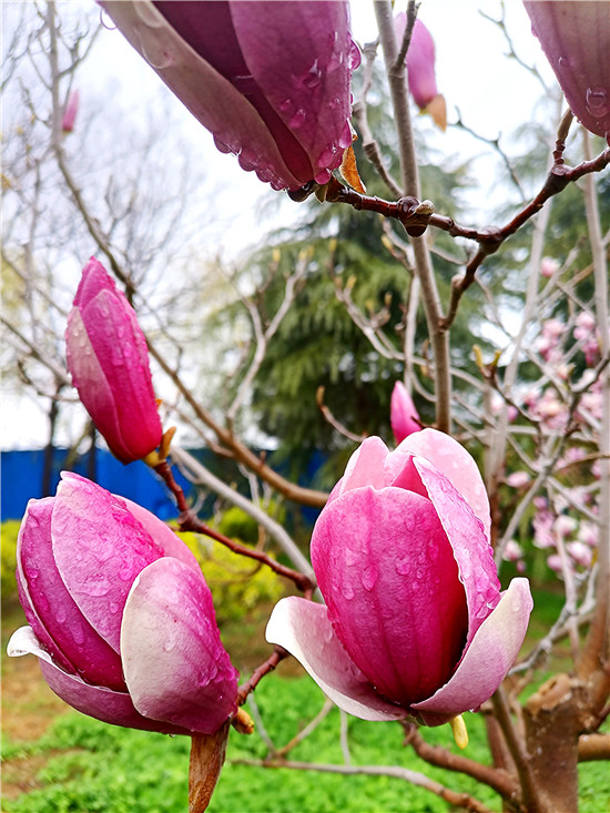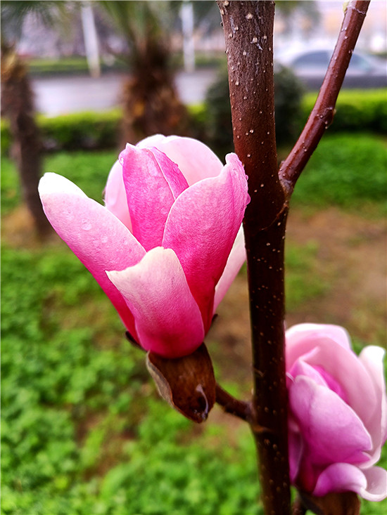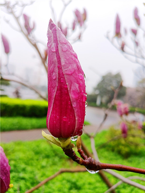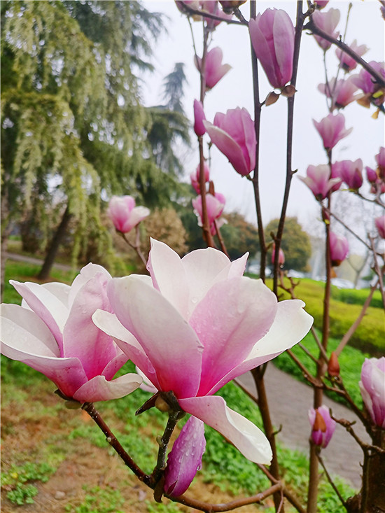 “霓裳片片晚妝新,束素亭亭玉殿春。已向丹霞生淺暈,故將清露作芳?jí)m?!?月11日,我市下了一場(chǎng)小雨,路旁的紫玉蘭更顯晶瑩玉潤(rùn),朵朵玉蘭花如雨后新荷般清麗脫俗,或含苞待放、欲語還休,或花瓣盡展、舞姿翩翩,令人不禁駐足欣賞。