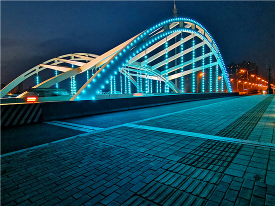 夜幕降臨時,流沙河泰山路橋溫馨的燈光亮了起來,夢幻藍(lán)、蘋果綠、水晶紫、多種顏色變換的橋體顯得熠熠生輝 ,多彩的橋在水面的映襯下流光溢彩。