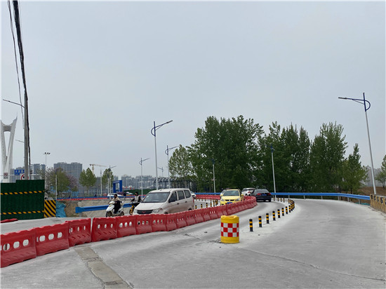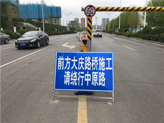 在大慶路橋南、北兩個上橋口,已安裝了高為2.2米的限高桿,施工路段的東側修有4個車道的便道,各車道中間設有臨時護欄,低于2.2米的車輛可以通行。值得提醒的是,該路段早、晚高峰期時較為擁堵,希望市民提前繞行(可繞行至中原路、八一大道)。