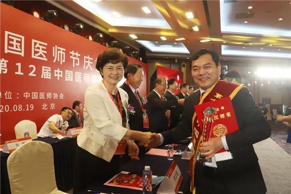 圖為:2020年8月在第十二屆中國醫(yī)師獎頒獎典禮上接受李蘭娟院士頒獎