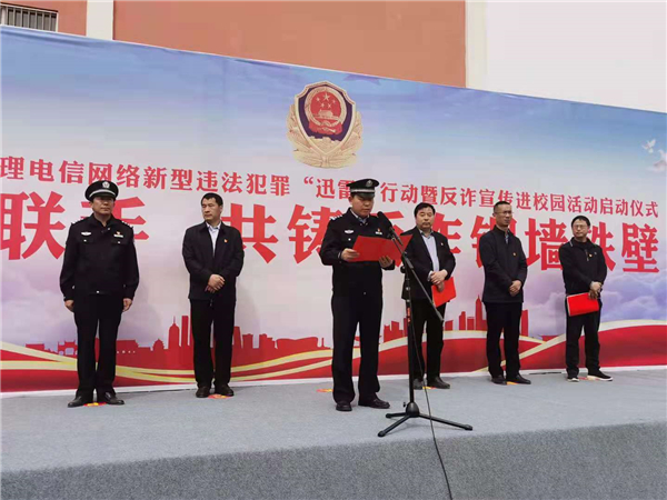 4月18日上午,鄲城縣打擊治理電信網(wǎng)絡(luò)新型違法犯罪“迅雷”行動暨反詐宣傳進校園活動儀式在縣三高啟動??h政府副縣長、公安局長陳鳳祥,縣政府辦公室主任賈培民,縣教體局黨組書記、局長羅明黨等出席啟動儀式,縣打擊治理電信網(wǎng)絡(luò)新型違法犯罪工作各成員單位、縣公安局、縣三高分別組成代表隊2200余人參加啟動儀式,儀式由賈培民主持。