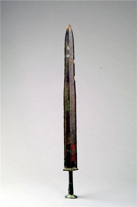 劍,古代冷兵器,屬于“短兵”,乃是兵中王者,被稱為“百兵之君”。開(kāi)雙刃身直頭尖,橫豎可傷人,擊刺可透甲,兇險(xiǎn)異常,生而為殺。也用以佩帶,以顯示貴族的身份地位。青銅劍,一般是銅、錫合金冶煉鑄造而成的,商周時(shí)期開(kāi)始出現(xiàn),春秋戰(zhàn)國(guó)時(shí)期達(dá)到頂峰,一直延續(xù)到秦漢,隨著鐵劍的出現(xiàn)才銷聲匿跡。越王劍,本是越王所鑄之劍,也可用于賞賜和饋贈(zèng)。