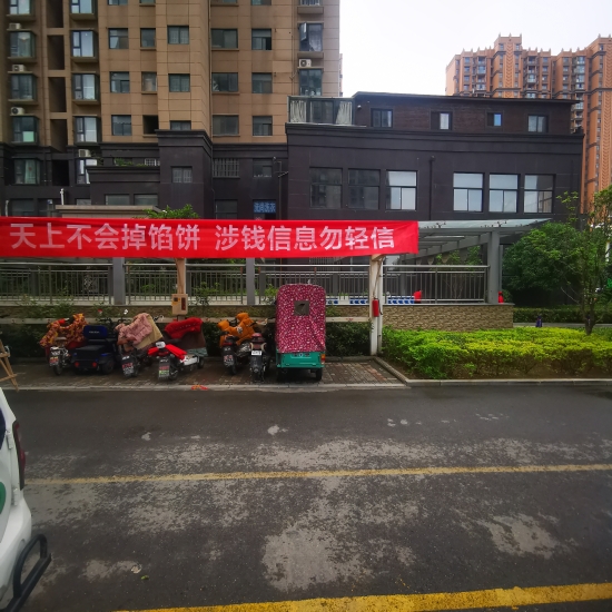 據(jù)介紹,“金色東方”小區(qū)建成于2014年,占地120畝,居住人口2516戶,共8176人。廣場是小區(qū)里最熱鬧的地方。這里不僅擺放著詐騙案例展板,而且LED大屏上反復(fù)播放“局長說反詐”視頻,時刻提醒居民繃緊防詐弦。通過張貼標語、擺放展板、播放視頻等形式,“金色東方”小區(qū)營造了全方位反詐的濃厚氛圍,基本達到“處處有提醒”的效果。據(jù)悉,2月份以來,該小區(qū)未發(fā)生一起電信網(wǎng)絡(luò)詐騙案件。