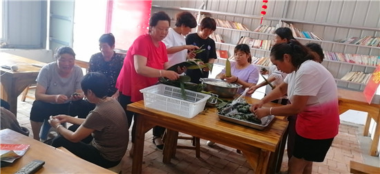 6月14日上午,西華縣奉母鎮(zhèn)七二村、前邵村、劉莊村的鄉(xiāng)村大食堂里笑聲不斷,“兩委”干部、文藝宣傳隊員將粽葉、糯米、紅棗、花生等食材仔細(xì)洗干凈,一起折粽葉、裝糯米、放餡料、裹扎繩……大家相互指導(dǎo)、相互配合,一派“碧艾香蒲處處忙,誰家兒女慶端陽”的熱鬧景象。