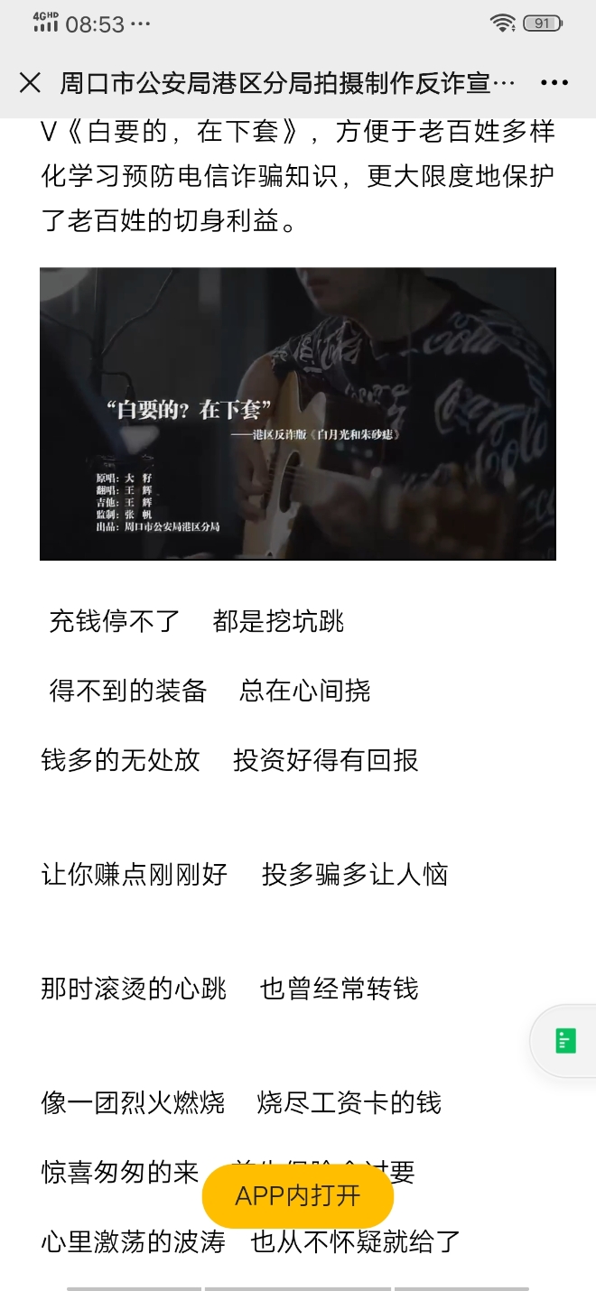 據(jù)悉,為進(jìn)一步提升轄區(qū)群眾防騙、識騙、拒騙能力,有效遏制網(wǎng)絡(luò)電信詐騙案件高發(fā)態(tài)勢,周口市公安局港區(qū)分局以張貼廣告條幅、深入各企事業(yè)單位開展宣傳講座等措施完成原有“規(guī)定動作”,不斷創(chuàng)新宣傳方式,從電信詐騙的種類、手段、作案特點(diǎn)以及甄別電信詐騙的方法和技巧等方面進(jìn)行制作宣傳,營造了濃厚的防電信詐騙宣傳氛圍。截至目前,該分局推廣、注冊“金鐘罩”APP達(dá)20000人次,取得明顯效果。③5