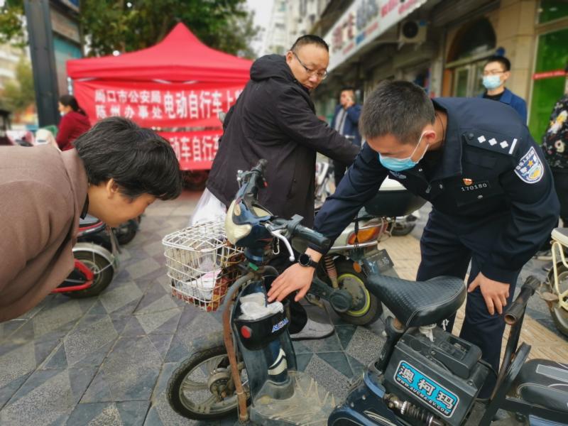 在中心城區(qū)交通大道與五一路交叉口的陳州辦事處電動自行車上牌處,不少車輛已經(jīng)上過牌照停放在規(guī)定地點(diǎn)?!拔沂乔疤焐系呐普?,家里需要,我就買了輛新電動自行車,各項(xiàng)材料齊全,拿到上牌點(diǎn)很快就完成了上牌?!奔易「浇氖忻窭钆空f。