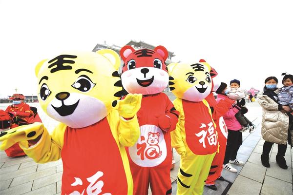 • 2月15日,幾名工作人員身穿萌虎造型服裝向市民招手。當日,由市文化廣電和旅游局主辦,市文化館、市美術館、市圖書館承辦的“我們的節(jié)日‘元宵節(jié)’——周口市群眾文化系列活動‘寅虎賀春鬧元宵’”在市文化藝術中心舉行。